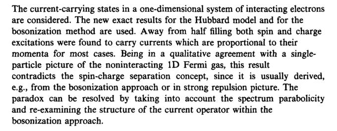 The current-carrying states in a one-dimensional system of interacting electrons are considered. The new exact results for the Hubbard model and for the bosonization method are used. Away from half filling both spin and charge excitations were found to carry currents which are proportional to their momenta for most cases. Being in a qualitative agreement with a single-particle picture of the noninteracting ID Fermi gas, this result contradicts the spin-charge separation concept, since it is usually derived, e.g., from the bosonization approach or in strong repulsion picture. The paradox can be resolved by taking into account the spectrum parabolicity and re-examining the structure of the current operator within the bosonization approach.