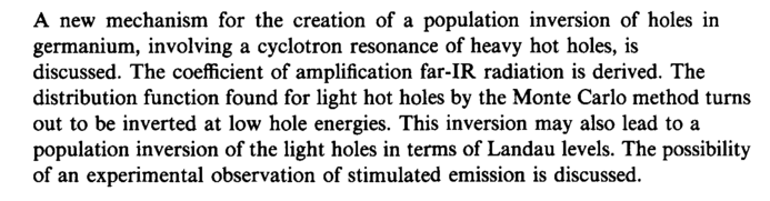A new mechanism for the creation of a population inversion of holes in germanium, involving a cyclotron resonance of heavy hot holes, is discussed. The coefficient of amplification far-IR radiation is derived. The distribution function found for light hot holes by the Monte Carlo method turns out to be inverted at low hole energies. This inversion may also lead to a population inversion of the light holes in terms of Landau levels. The possibility of an experimental observation of stimulated emission is discussed.