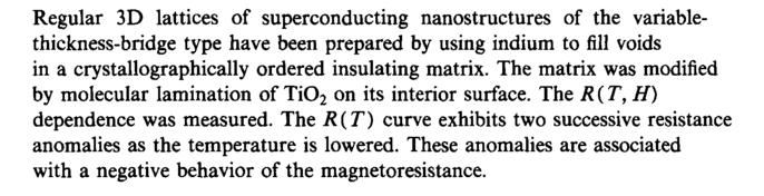 Regular 3D lattices of superconducting nanostructures of the variable-thickness-bridge type have been prepared by using indium to fill voids in a crystallographically ordered insulating matrix. The matrix was modified by molecular lamination of Ti02 on its interior surface. The R(T9H) dependence was measured. The R(T) curve exhibits two successive resistance anomalies as the temperature is lowered. These anomalies are associated with a negative behavior of the magnetoresistance.