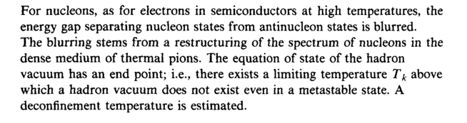 For nucleons, as for electrons in semiconductors at high temperatures, the energy gap separating nucleon states from antinucleon states is blurred. The blurring stems from a restructuring of the spectrum of nucleons in the dense medium of thermal pions. The equation of state of the hadron vacuum has an end point; i.e., there exists a limiting temperature Tk above which a hadron vacuum does not exist even in a metastable state. A deconfinement temperature is estimated.