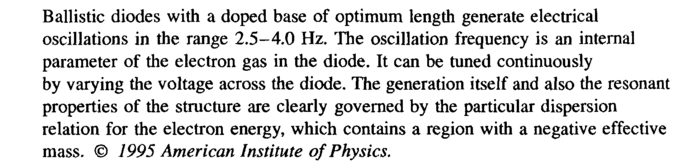 Ballistic diodes with a doped base of optimum length generate electrical oscillations in the range 2.5-4.0 Hz. The oscillation frequency is an internal parameter of the electron gas in the diode. It can be tuned continuously by varying the voltage across the diode. The generation itself and also the resonant properties of the structure are clearly governed by the particular dispersion relation for the electron energy, which contains a region with a negative effective mass. © 1995 American Institute of Physics.