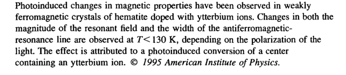 Photoinduced changes in magnetic properties have been observed in weakly ferromagnetic crystals of hematite doped with ytterbium ions. Changes in both the magnitude of the resonant field and the width of the antiferromagnetic-resonance line are observed at T< 130 K, depending on the polarization of the light. The effect is attributed to a photoinduced conversion of a center containing an ytterbium ion. © 1995 American Institute of Physics.