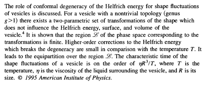 The role of conformal degeneracy of the Helfrich energy for shape fluctuations of vesicles is discussed. For a vesicle with a nontrivial topology (genus g>l) there exists a two-parametric set of transformations of the shape which does not influence the Helfrich energy, surface, and volume of the vesicle.4 It is shown that the region S% of the phase space corresponding to the transformations is finite. Higher-order corrections to the Helfrich energy which breaks the degeneracy are small in comparison with the temperature T. It leads to the equipartition over the region 2§. The characteristic time of the shape fluctuations of a vesicle is on the order of ηϋ3/Τ, where Τ is the temperature, η is the viscosity of the liquid surrounding the vesicle, and R is its size. © 1995 American Institute of Physics.
