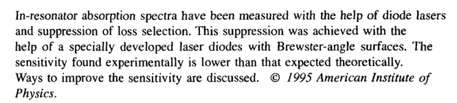 In-resonator absorption spectra have been measured with the help of diode lasers and suppression of loss selection. This suppression was achieved with the help of a specially developed laser diodes with Brewster-angle surfaces. The sensitivity found experimentally is lower than that expected theoretically. Ways to improve the sensitivity are discussed. © 1995 American Institute of Physics.