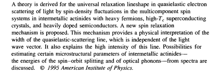A theory is derived for the universal relaxation lineshape in quasielastic electron scattering of light by spin-density fluctuations in the multicomponent spin systems in intermetallic actinides with heavy fermions, high-rc superconducting crystals, and heavily doped semiconductors. A new spin relaxation mechanism is proposed. This mechanism provides a physical interpretation of the width of the quasielastic-scattering line, which is independent of the light wave vector. It also explains the high intensity of this line. Possibilities for estimating certain microstructural parameters of intermetallic actinides— the energies of the spin-orbit splitting and of optical phonons—from spectra are discussed. © 1995 American Institute of Physics.