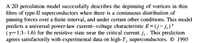 A 2D percolation model successfully describes the depinning of vortices in thin films of type-II superconductors when there is a continuous distribution of pinning forces over a finite interval, and under certain other conditions. This model predicts a universal power-law current-voltage characteristic E=(j — jc)y 1.3-1.6) for the resistive state near the critical current jc. This prediction agrees satisfactorily with experimental data on high-rc superconductors. © 7995