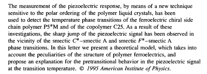 The measurement of the piezoelectric response, by means of a new technique sensitive to the polar ordering of the polymer liquid crystals, has been used to detect the temperature phase transitions of the ferroelectric chiral side chain polymer P5*M and of the copolymer C25. As a result of these investigations, the sharp jump of the piezoelectric signal has been observed in the vicinity of the smectic C*-smectic A and smectic F*-smectic A phase transitions. In this letter we present a theoretical model, which takes into account the peculiarities of the structure of polymer ferroelectrics, and propose an explanation for the pretransitional behavior in the piezoelectric signal at the transition temperature. © 1995 American Institute of Physics.