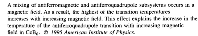 A mixing of antiferromagnetic and antiferroquadrupole subsystems occurs in a magnetic field. As a result, the highest of the transition temperatures increases with increasing magnetic field. This effect explains the increase in the temperature of the antiferroquadrupole transition with increasing magnetic field in CeB6. © 1995 American Institute of Physics.