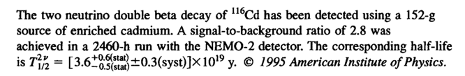 The two neutrino double beta decay of 116Cd has been detected using a 152-g source of enriched cadmium. A signal-to-background ratio of 2.8 was achieved in a 2460-h run with the NEMO-2 detector. The corresponding half-life is 7^ = [3.6i^$±0.3(syst)]X1019y. © 1995 American Institute of Physics.