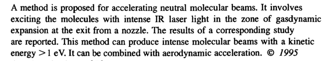 A method is proposed for accelerating neutral molecular beams. It involves exciting the molecules with intense IR laser light in the zone of gasdynamic expansion at the exit from a nozzle. The results of a corresponding study are reported. This method can produce intense molecular beams with a kinetic energy > 1 eV. It can be combined with aerodynamic acceleration. © 1995