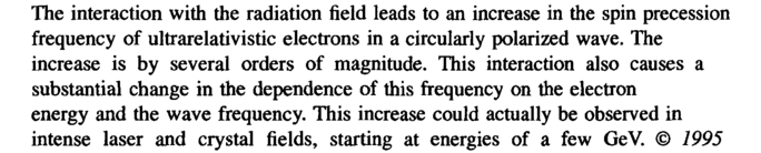The interaction with the radiation field leads to an increase in the spin precession frequency of ultrarelativistic electrons in a circularly polarized wave. The increase is by several orders of magnitude. This interaction also causes a substantial change in the dependence of this frequency on the electron energy and the wave frequency. This increase could actually be observed in intense laser and crystal fields, starting at energies of a few GeV. © 1995