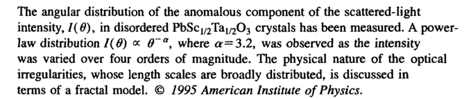 The angular distribution of the anomalous component of the scattered-light intensity, 1(0), in disordered òøâÓ^ôÁÝïÚ crystals has been measured. A power-law distribution Ι(θ) α Q~a, where or—3.2, was observed as the intensity was varied over four orders of magnitude. The physical nature of the optical irregularities, whose length scales are broadly distributed, is discussed in terms of a fractal model. © 1995 American Institute of Physics.