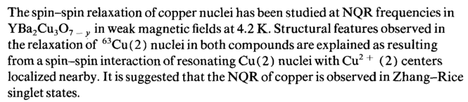 The spin-spin relaxation of copper nuclei has been studied at NQR frequencies in YBa2Cu307 __ y in weak magnetic fields at 4.2 K. Structural features observed in the relaxation of 63Cu (2) nuclei in both compounds are explained as resulting from a spin-spin interaction of resonating Cu (2) nuclei with Си2 + (2) centers localized nearby. It is suggested that the NQR of copper is observed in Zhang-Rice singlet states.