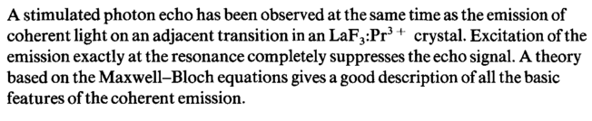 A stimulated photon echo has been observed at the same time as the emission of coherent light on an adjacent transition in an LaF3:Pr3 + crystal. Excitation of the emission exactly at the resonance completely suppresses the echo signal. A theory based on the Maxwell-Bloch equations gives a good description of all the basic features of the coherent emission.