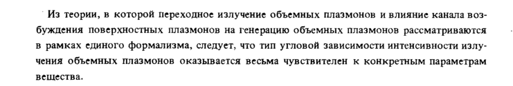 Из теории, в которой переходное излучение объемных плазмонов и влияние канала возбуждения поверхностных плазмонов на генерацию объемных плазмонов рассматриваются в рамках единого формализма, следует, что тип угловой зависимости интенсивности излучения объемных плазмонов оказывается весьма чувствителен к конкретным параметрам вещества.