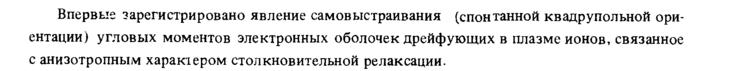 Впервые зарегистрировано явление самовыстраивания (спонтанной квадрупольной ориентации) угловых моментов электронных оболочек дрейфующих в плазме ионов, связанное с анизотропным характером столкновительной релаксации.