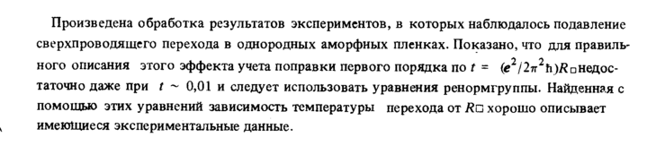 Произведена обработка результатов экспериментов, в которых наблюдалось подавление сверхпроводящего перехода в однородных аморфных пленках. Показано, что для правильного описания этого эффекта учета поправки первого порядка по t (β2/2π2ίι)Λ□недостаточно даже при t ~ 0,01 и следует использовать уравнения ренормгруппы. Найденная с помощью этих уравнений зависимость температуры перехода от Rn хорошо описывает имеющиеся экспериментальные данные.