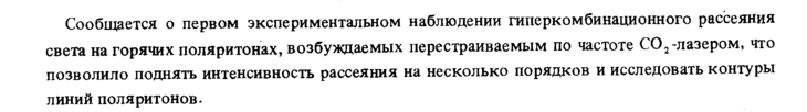 Сообщается о первом экспериментальном наблюдении гиперкомбинационного рассеяния света на горячих поляритонах, возбуждаемых перестраиваемым по частоте С02 -лазером, что позволило поднять интенсивность рассеяния на несколько порядков и исследовать контуры линий поляритонов.
