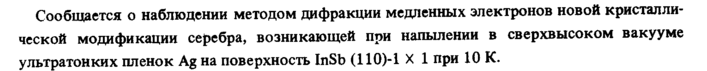 Сообщается о наблюдении методом дифракции медленных электронов новой кристаллической модификации серебра, возникающей при напылении в сверхвысоком вакууме ультратонких пленок Ag на поверхность InSb (110)-1 Χ 1 при 10 К.