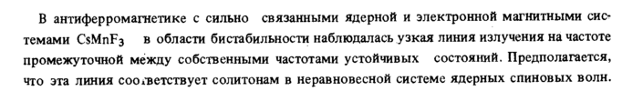 В антиферромагнетике с сильно связанными ядерной и электронной магнитными системами CsMnF3 в области би стабильности наблюдалась узкая линия излучения на частоте промежуточной между собственными частотами устойчивых состояний. Предполагается, что эта линия соответствует солитонам в неравновесной системе ядерных спиновых волн.