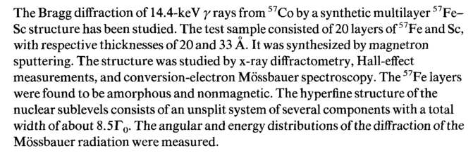 The Bragg diffraction of 14.4-keV γ rays from 57Co by a synthetic multilayer 57Fe-Sc structure has been studied. The test sample consisted of 20 layers of 57Fe and Sc, with respective thicknesses of 20 and 33 A. It was synthesized by magnetron sputtering. The structure was studied by x-ray diffractometry, Hall-effect measurements, and conversion-electron Mossbauer spectroscopy. The 57Fe layers were found to be amorphous and nonmagnetic. The hyperfine structure of the nuclear sublevels consists of an unsplit system of several components with a total width of about 8.5Γ0. The angular and energy distributions of the diffraction of the Mossbauer radiation were measured.