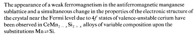 The appearance of a weak ferromagnetism in the antiferromagnetic manganese sublattice and a simultaneous change in the properties of the electronic structure of the crystal near the Fermi level due to 4f states of valence-unstable cerium have been observed in CeMn2 _ xSi2 + x alloys of variable composition upon the substitutions Mn «=t Si.
