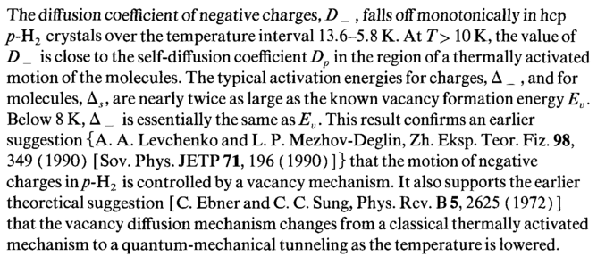 ![The diffusion coefficient of negative charges, <i>D _ </i>, falls off monotonically in hep <i>p-K<sub>2</sub> </i>crystals over the temperature interval 13.6-5.8 K. At <i>T> </i>10 K, the value of <i>D </i>is close to the self-diffusion coefficient <i>D<sub>p</sub> </i>in the region of a thermally activated motion of the molecules. The typical activation energies for charges, Δ _ , and for molecules, <i>A<sub>s</sub></i>, are nearly twice as large as the known vacancy formation energy <i>E<sub>tt</sub>. </i>Below 8 Κ, Δ _ is essentially the same as <i>E<sub>v</sub>. </i>This result confirms an earlier suggestion {A. A. Levchenko and L. P. Mezhov-Deglin, Zh. Eksp. Teor. Fiz. 98, 349 (1990) [Sov. Phys. JETP 71,196 (1990) ]} that the motion of negative charges in<i>p-H<sub>2</sub> </i>is controlled by a vacancy mechanism. It also supports the earlier theoretical suggestion [ C. Ebner and С. C. Sung, Phys. Rev. В 5,2625 (1972) ] that the vacancy diffusion mechanism changes from a classical thermally activated mechanism to a quantum-mechanical tunneling as the temperature is lowered.](/ps/1200/article_18128_800_head.png)