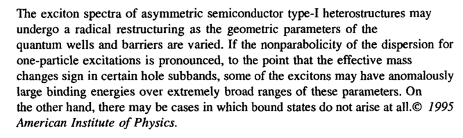 The exciton spectra of asymmetric semiconductor type-I heterostructures may undergo a radical restructuring as the geometric parameters of the quantum wells and barriers are varied. If the nonparabolicity of the dispersion for one-particle excitations is pronounced, to the point that the effective mass changes sign in certain hole subbands, some of the excitons may have anomalously large binding energies over extremely broad ranges of these parameters. On the other hand, there may be cases in which bound states do not arise at all.© 1995 American Institute of Physics.