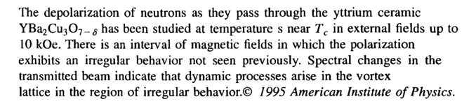 The depolarization of neutrons as they pass through the yttrium ceramic YBa2Cu307_(j has been studied at temperature s near Tc in external fields up to 10 kOe. There is an interval of magnetic fields in which the polarization exhibits an irregular behavior not seen previously. Spectral changes in the transmitted beam indicate that dynamic processes arise in the vortex lattice in the region of irregular behavior.© 1995 American Institute of Physics.