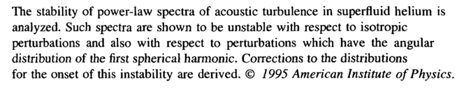 The stability of power-law spectra of acoustic turbulence in superfluid helium is analyzed. Such spectra are shown to be unstable with respect to isotropic perturbations and also with respect to perturbations which have the angular distribution of the first spherical harmonic. Corrections to the distributions for the onset of this instability are derived. © 1995 American Institute of Physics.