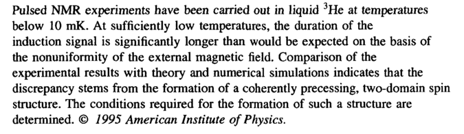 Pulsed NMR experiments have been carried out in liquid 3He at temperatures below 10 mK. At sufficiently low temperatures, the duration of the induction signal is significantly longer than would be expected on the basis of the nonuniformity of the external magnetic field. Comparison of the experimental results with theory and numerical simulations indicates that the discrepancy stems from the formation of a coherently precessing, two-domain spin structure. The conditions required for the formation of such a structure are determined. © 1995 American Institute of Physics.