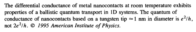 The differential conductance of metal nanocontacts at room temperature exhibits properties of a ballistic quantum transport in ID systems. The quantum of conductance of nanocontacts based on a tungsten tip 1 nm in diameter is e2/h, not 2e2/h. © 1995 American Institute of Physics.