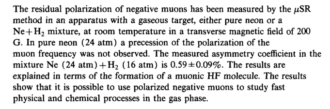 The residual polarization of negative muons has been measured by the μSR method in an apparatus with a gaseous target, either pure neon or a Ne+H2 mixture, at room temperature in a transverse magnetic field of 200 G. In pure neon (24 atm) a precession of the polarization of the muon frequency was not observed. The measured asymmetry coefficient in the mixture Ne (24 atm)+H2 (16 atm) is 0.59±0.09%. The results are explained in terms of the formation of a muonic HF molecule. The results show that it is possible to use polarized negative muons to study fast physical and chemical processes in the gas phase.