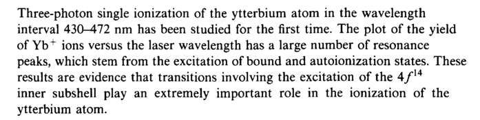 Three-photon single ionization of the ytterbium atom in the wavelength interval 430-472 nm has been studied for the first time. The plot of the yield of Yb+ ions versus the laser wavelength has a large number of resonance peaks, which stem from the excitation of bound and autoionization states. These results are evidence that transitions involving the excitation of the 4fH inner subshell play an extremely important role in the ionization of the ytterbium atom.