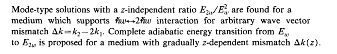 Mode-type solutions with a z-independent ratio E2w/Ew are found for a medium which supports Hw^lHw interaction for arbitrary wave vector mismatch Ak=k2 — 2kl. Complete adiabatic energy transition from Ew to E2w is proposed for a medium with gradually z-dependent mismatch Ak(z).