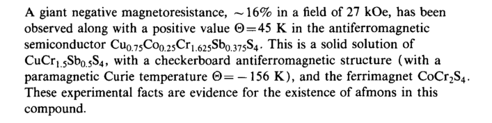 A giant negative magnetoresistance, ~ 16% in a field of 27 kOe, has been observed along with a positive value Θ = 45 К in the antiferromagnetic semiconductor Cuo.75Coo.25Cr! .625^0.37584. This is a solid solution of CuCri 5Sbo.5S4, with a checkerboard antiferromagnetic structure (with a paramagnetic Curie temperature Θ= —156 К), and the ferrimagnet CoCr2S4. These experimental facts are evidence for the existence of afmons in this compound.