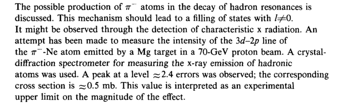 The possible production of π" atoms in the decay of hadron resonances is discussed. This mechanism should lead to a filling of states with ΙφΟ. It might be observed through the detection of characteristic χ radiation. An attempt has been made to measure the intensity of the 3d-2p line of the ir--Ne atom emitted by a Mg target in a 70-GeV proton beam. A crystal-diffraction spectrometer for measuring the x-ray emission of hadronic atoms was used. A peak at a level zz2A errors was observed; the corresponding cross section is ~0.5 mb. This value is interpreted as an experimental upper limit on the magnitude of the effect.