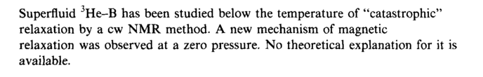 Superfluid 3He-B has been studied below the temperature of "catastrophic" relaxation by a cw NMR method. A new mechanism of magnetic relaxation was observed at a zero pressure. No theoretical explanation for it is available.