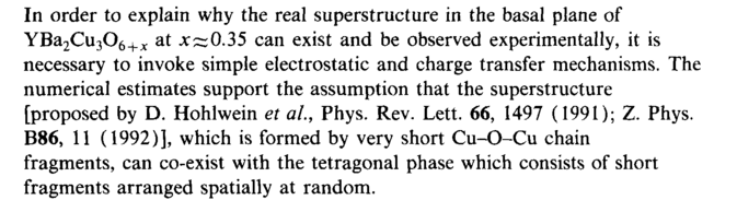 In order to explain why the real superstructure in the basal plane of ¥÷Á2óÉ306_|_È at x~0.35 can exist and be observed experimentally, it is necessary to invoke simple electrostatic and charge transfer mechanisms. The numerical estimates support the assumption that the superstructure [proposed by D. Hohlwein et al., Phys. Rev. Lett. 66, 1497 (1991); Z. Phys. B86, 11 (1992)], which is formed by very short Cu-O-Cu chain fragments, can co-exist with the tetragonal phase which consists of short fragments arranged spatially at random.