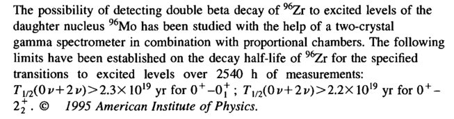 The possibility of detecting double beta decay of Zr to excited levels of the daughter nucleus 96Mo has been studied with the help of a two-crystal gamma spectrometer in combination with proportional chambers. The following limits have been established on the decay half-life of 96Zr for the specified transitions to excited levels over 2540 h of measurements: TU2(0v+2v)>23X 1019 yr for 0 + -θί"; TU2(0v+2v)>2.2X 1019 yr for 0 + -2 2 ■ © 1995 American Institute of Physics.
