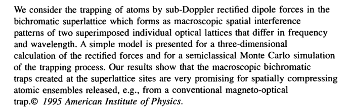 We consider the trapping of atoms by sub-Doppler rectified dipole forces in the bichromatic superlattice which forms as macroscopic spatial interference patterns of two superimposed individual optical lattices that differ in frequency and wavelength. A simple model is presented for a three-dimensional calculation of the rectified forces and for a semiclassical Monte Carlo simulation of the trapping process. Our results show that the macroscopic bichromatic traps created at the superlattice sites are very promising for spatially compressing atomic ensembles released, e.g., from a conventional magneto-optical trap.© 1995 American Institute of Physics.