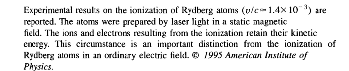 Experimental results on the ionization of Rydberg atoms {vie— 1.4X 10~3) are reported. The atoms were prepared by laser light in a static magnetic field. The ions and electrons resulting from the ionization retain their kinetic energy. This circumstance is an important distinction from the ionization of Rydberg atoms in an ordinary electric field. © 7995 American Institute of Physics.