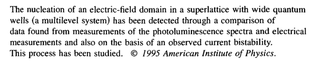 The nucleation of an electric-field domain in a superlattice with wide quantum wells (a multilevel system) has been detected through a comparison of data found from measurements of the photoluminescence spectra and electrical measurements and also on the basis of an observed current bistability. This process has been studied. © 1995 American Institute of Physics.