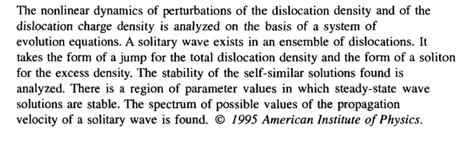 The nonlinear dynamics of perturbations of the dislocation density and of the dislocation charge density is analyzed on the basis of a system of evolution equations. A solitary wave exists in an ensemble of dislocations. It takes the form of a jump for the total dislocation density and the form of a soliton for the excess density. The stability of the self-similar solutions found is analyzed. There is a region of parameter values in which steady-state wave solutions are stable. The spectrum of possible values of the propagation velocity of a solitary wave is found. © 1995 American Institute of Physics.