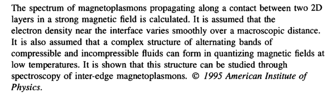 The spectrum of magnetoplasmons propagating along a contact between two 2D layers in a strong magnetic field is calculated. It is assumed that the electron density near the interface varies smoothly over a macroscopic distance. It is also assumed that a complex structure of alternating bands of compressible and incompressible fluids can form in quantizing magnetic fields at low temperatures. It is shown that this structure can be studied through spectroscopy of inter-edge magnetoplasmons. © 1995 American Institute of Physics.