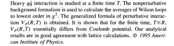Heavy qq interaction is studied at a finite time Г. The nonperturbative background formalism is used to calculate the averages of Wilson loops to lowest order in g2. The generalized formula of perturbative interaction VP(R,T) is obtained. It is shown that for the finite time, T^SR, VP(R,T) essentially differs from Coulomb potential. Our analytical results are in good agreement with lattice calculations. © 1995 American Institute of Physics.
