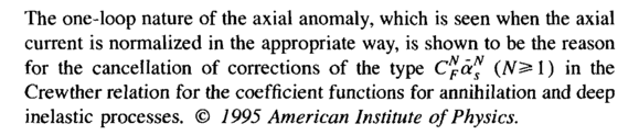 The one-loop nature of the axial anomaly, which is seen when the axial current is normalized in the appropriate way, is shown to be the reason for the cancellation of corrections of the type CNF (N> 1) in the Crewfher relation for the coefficient functions for annihilation and deep inelastic processes. © 1995 American Institute of Physics.