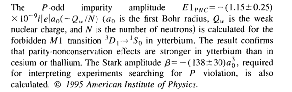 The F-odd impurity amplitude El PNC= — (1.15±0.25) X I0~9/|e|a0( — QWIN) (a0 is the first Bohr radius, Qw is the weak nuclear charge, and N is the number of neutrons) is calculated for the forbidden Ml transition 3£)1—>'50 in ytterbium. The result confirms that parity-nonconservation effects are stronger in ytterbium than in cesium or thallium. The Stark amplitude β= — (138±30)ag, required for interpreting experiments searching for Ρ violation, is also calculated. © 1995 American Institute of Physics.