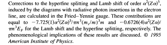 Corrections to the hyperfine splitting and Lamb shift of order ar^Za)5, induced by the diagrams with radiative photon insertions in the electron line, are calculated in the Fried-Yennie gauge. These contributions are equal to -7.725(l)a2(Za)5/7rn3(wr/w)3m and -0.6726(4)α^Ζα)/ ÔÔÐßåÒ for the Lamb shift and the hyperfine splitting, respectively. The phenomenological implications of these results are discussed. © 1995 American Institute of Physics.