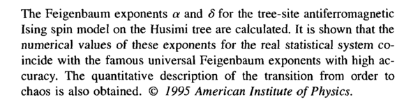 The Feigenbaum exponents a and «5 for the tree-site antiferromagnetic Ising spin model on the Husimi tree are calculated. It is shown that the numerical values of these exponents for the real statistical system coincide with the famous universal Feigenbaum exponents with high accuracy. The quantitative description of the transition from order to chaos is also obtained. © 1995 American Institute of Physics.
